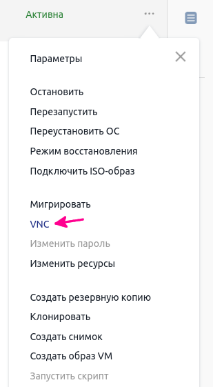 Перейдите в раздел « Виртуальные машины», выберите нужный сервер нажмите на иконку трёх точек в конце строки и в появившемся контекстном меню нажмите на кнопку «VNC».