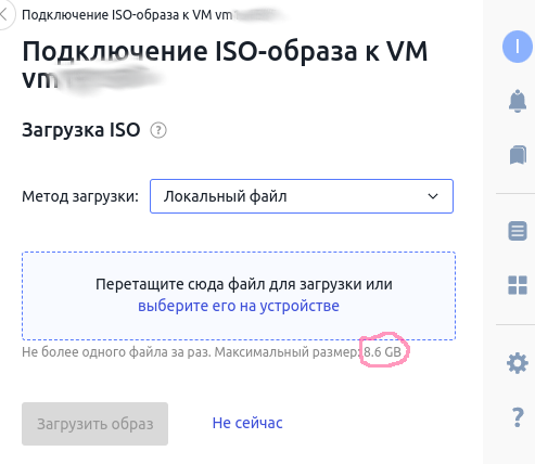 3) В открывшемся контекстном меню выберите способ загрузки вашего образа: локальный, с вашего ПК или по ссылке - с внешнего хранилища образа. Обратите внимание на то, что во втором случае вам понадобится указать т.н. прямую ссылку, т.е. такую, по которой сможет сработать утилита wget http://www.example.com/your_image.iso - без указания каких-либо дополнительных параметров.